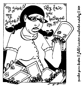 Ericka's pander zine distro is somewhat a "heaven on earth" for all grrrl and lady zine fans. She distributes zines from all over the world, hosts a wonderful message board and has an extensive link section, among other hundred wonderul things. I have had only the best experience ordering zines from Ericka, many of whom you see listed on my site. So go and check her site, if you are not familiar with it! You will see you are in heaven... Can you tell me first of all a little bit about yourself? How old are you, where are you originally from and where do you reside now? my name is ericka bailie, i'm 33, originally from los angeles, ca, moved to minneapolis, mn, 4 years ago from kansas city, mo. What do you do besides your zine? i stopped doing my regular zine several years ago. occasionally i put out a one-shot (most recently "fragile" in 2000). i have been running pander zine distro since late winter 1995. |